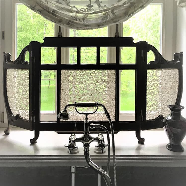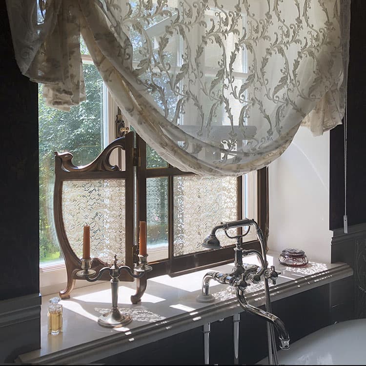 В этой статье хотим поделиться примером нестандартного подхода к дизайну штор в туалетной комнате. В помещении этой довольно просторной комнаты три окна, для которых наши дизайнеры подобрали очень красивые кружевные шторы, не закрывающие окно полностью. Отдельно стоящая чугунная ванна разместилась как раз напротив окон, поэтому для создания приватности и уюта мы предложили поставить на окно маленькую ширму, разработав ее специально для этого проекта.